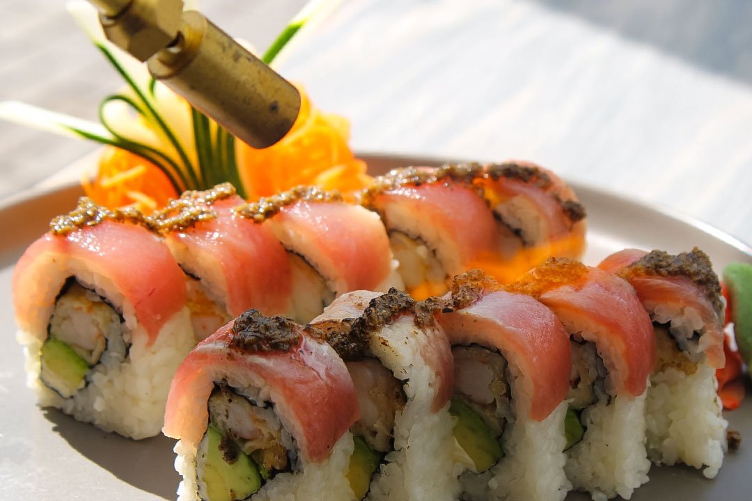 Rollos con camarón, aguacate y queso crema, cubiertos con finas láminas de atún y un chimichurri de la casa.
